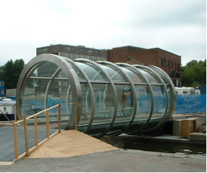The Helix Bridge at the Paddington Basin development adjacent to Paddington Station is a retractable, composite glass and steel pedestrian bridge. It has a helical frame which rotates during deployment to give the apprarance of it corkscrewing across the canal. AK Heavy Engineering used LUSAS to ensure that the proposed form of construction would not excessively stress the glass or adhesive bonds whilst operating under self-weight.