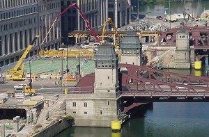 Wacker Drive 재건의 두 번째 단계에서는 이축 포스트텐셔닝 고성능 콘크리트 슬래브 구조물이 도입되어 교량 재건을 진행합니다. 이 과정에서 하중 최적화를 통해 역동적인 구조 해석이 이루어집니다.