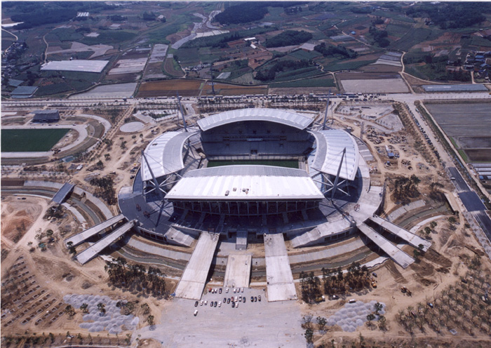 영국의 Tony Gee & Partners사(이하 TGP)는 한맥중공업과 계약하에 2002년 월드컵 경기를 위해 지어지는 11개의 새로운 경기장의 하나로 4,200석을 가진 전주 월드컵 경기장의 260m x 160m 지붕구조의 해석을 수행하였다. A자 형태의 기둥으로 부터 지지받는 트러스 구조와 4개의 63m 높이의 기둥을 중심으로 부채꼴로 펼쳐지는 케이블에 의해 지지되는 링 트러스 구조로 구성되어 있다.