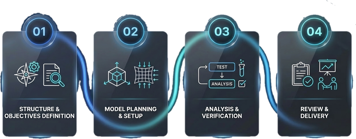 LUSAS 컨설팅은 구조물의 특성·검토 목적을 명확히 정의한 뒤, 적합한 모델링과 해석 전략을 수립하고 반복 검증을 통해 최적의 엔지니어링 결론을 도출하는 일관된 프로세스를 기반으로 합니다.