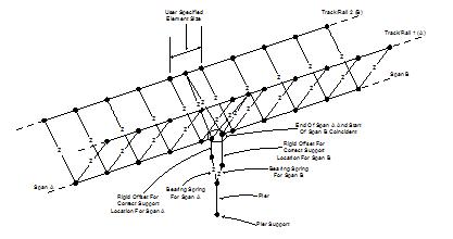 온도하중에 의한 휨 발생 등과 같이 장대레일을 가진 철도교의 거동을 효과적으로 표현하고, 길이가 0 인 요소일 때 가장 정확한 결과를 얻어내는 Joint 요소의 특성을 반영하기 위하여, 도상의 비선형특성을 반영하는 Joint 요소로 연결되는 레일과 교량상판은 모두 동일한 좌표에 위치하도록 하되 Eccentricity값을 명확히 지정하여 그 간격을 수학적으로 모델링에 반영하였으며, 교량상판의 중심축으로부터 교각까지의 거리를 표현하는 Rigid Beam을 추가하고 Constraint Equation을 적용함으로써 교좌받침의 위치가 Eccentricity=0 이 되도록 모델을 이상화 하는 가운데 교각과 교량상판의 경계조건이 충분히 반영되도록 하였다.