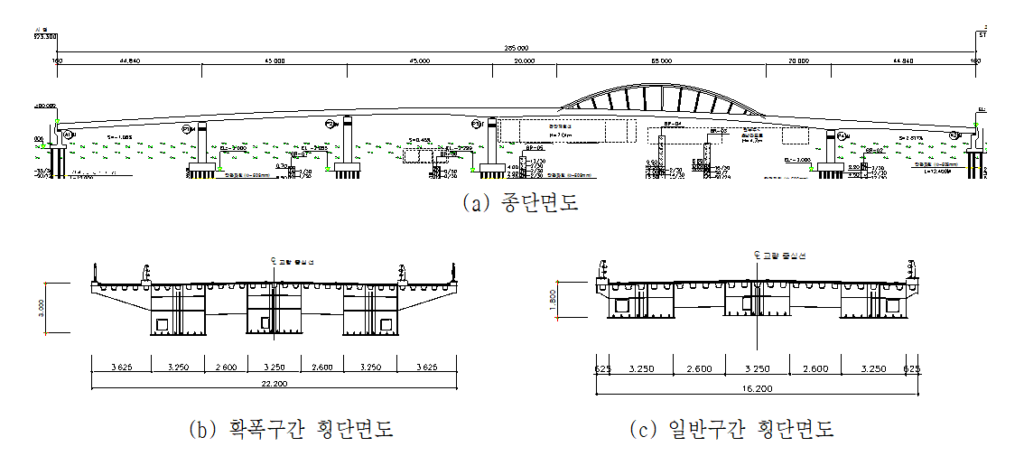 대상교량은 강상판형교로 5경간(3@45m+105m+45m) 연속교량으로 총 지간장은 285m이며, 4지간은 지간중앙부 교량 폭방향 중앙에 단독 아치로 보강되어 있다.