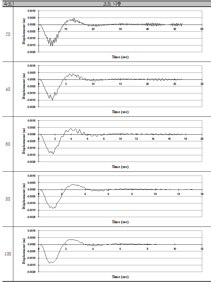 ISO 규정의 노면조도 5등급(very good, good, average, poor, very poor)중에서 대상교량의 공용초기에는 노면조도가 양호한 수준을 유지하는 경우인 very good(조도 좋음)의 경우로 가정하였으며 발생된 노면조도에 의하여 차량의 주행속도를 20km/hr에서 100km/hr까지 20km/hr씩 증가시켜가며 이동하중을 산정 (즉, 노면조도와 주행속도에 따라 달라지는 이동 하중 적용)