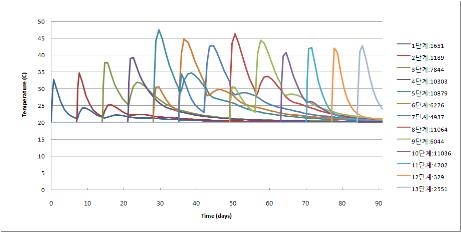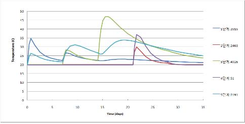 각 시공단계별 최대 온도 발생 위치의 온도변화