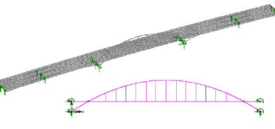 교량 전체 해석모델에는 3차원 보요소와 Shell 부재를 사용하여 해석하였으며 사하중 , 활하중, 지진하중, 온도하중, 지점침하, 풍하중이 고려되었다.