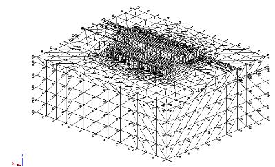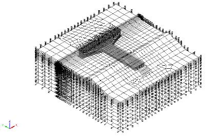 - 지반은 3차원 입체요소 (HX8M), 지반의 무한경계를 표현하기 위해 3차원 조인트 요소(JNT4, Joint properties general)를 사용하여 경계조건 구성