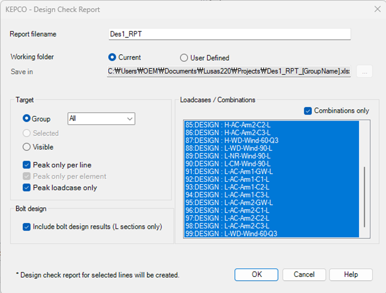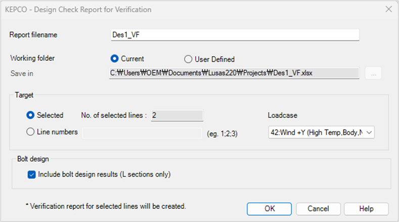 이 대화창을 열기 전에 LUSAS Modeller 에서 검증하고자 하는 부재를 선택하면, 대화창에서 ‘Selected’ 옵션이 선택되며 선택되어 있는 부재들을 보고서 출력 대상으로 설정됩니다.