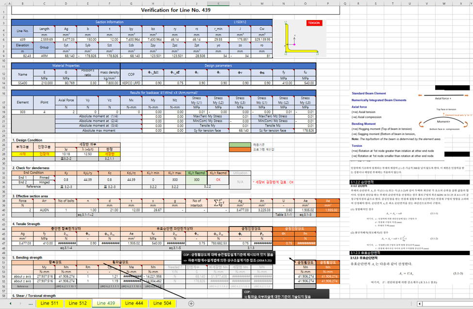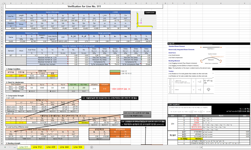 화면상에서 설계검토 결과를 검증하고자 하는 부재 (Line) 들을 선택한 후 대화창을 열면, 아래 그림과 같이 선택한 부재들에 대한 설계검토를 수행하는 과정을 정리한 검증용 Excel 파일이 생성됩니다.