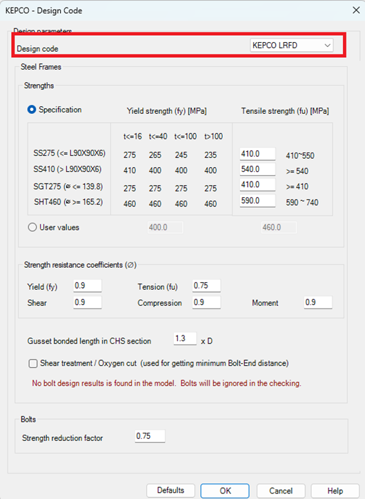 철탑 각 부재에 대한 설계검토 기준 및 주요 계수를 지정합니다. 본 예제에서는 초기값으로 정의된 계수를 사용합니다. 앞서 ‘최적부재’ 단계에서와 같이, 설계기준을 사전에 설정하지 않아도 설계검토 수행에는 문제가 없는데, 이런 경우에는 현재 대화창에 표시된 초기값에 따라 진행됩니다.