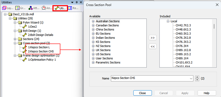 모델링 생성과정에서 ‘Pylon Definition>Geometric’ 탭에서 지정한 단면정보들을 사용하여 자동으로 생성되므로, 사용자가 별도로 수정할 필요는 없으나 최적화에 사용할 단면의 종류를 변경하고자 할 때 필요합니다.