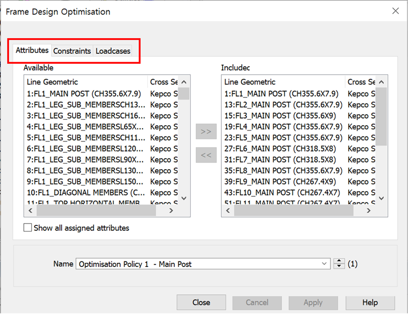 최적화를 수행할 대상 부재의 목록과 기준들을 지정합니다. 앞서 하중조합을 생성하는 단계에서 최적화 정책 기본값을 자동으로 생성하므로, 조건을 변경하지 않는 경우 별도로 지정할 필요가 없습니다.
