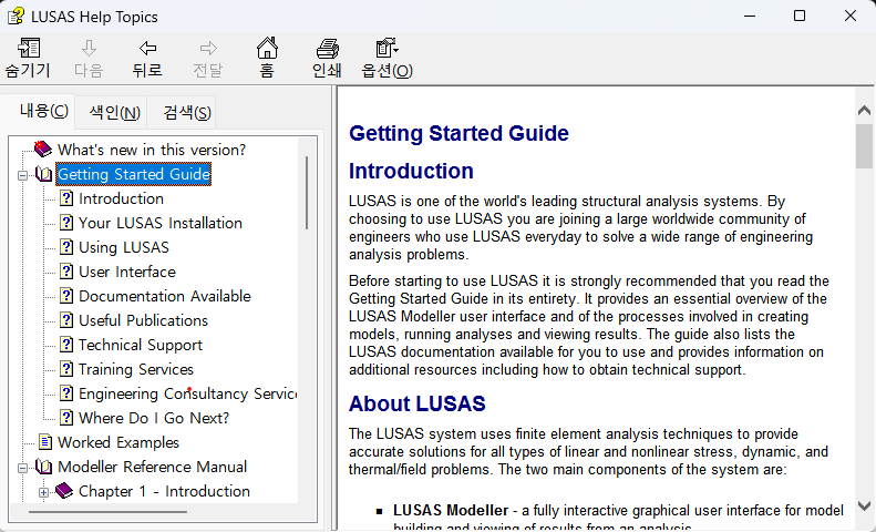 LUSAS 설치 후 Help 메뉴에서 직접 확인하거나 다운로드 할 수 있습니다.