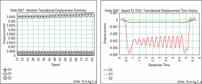 1) 최대 처짐 발생 위치에서의 처짐량의 변화 ( 속도별 변화 및 최대값이 발생한 83.3 kph 속도에 대한 시간이력 결과)