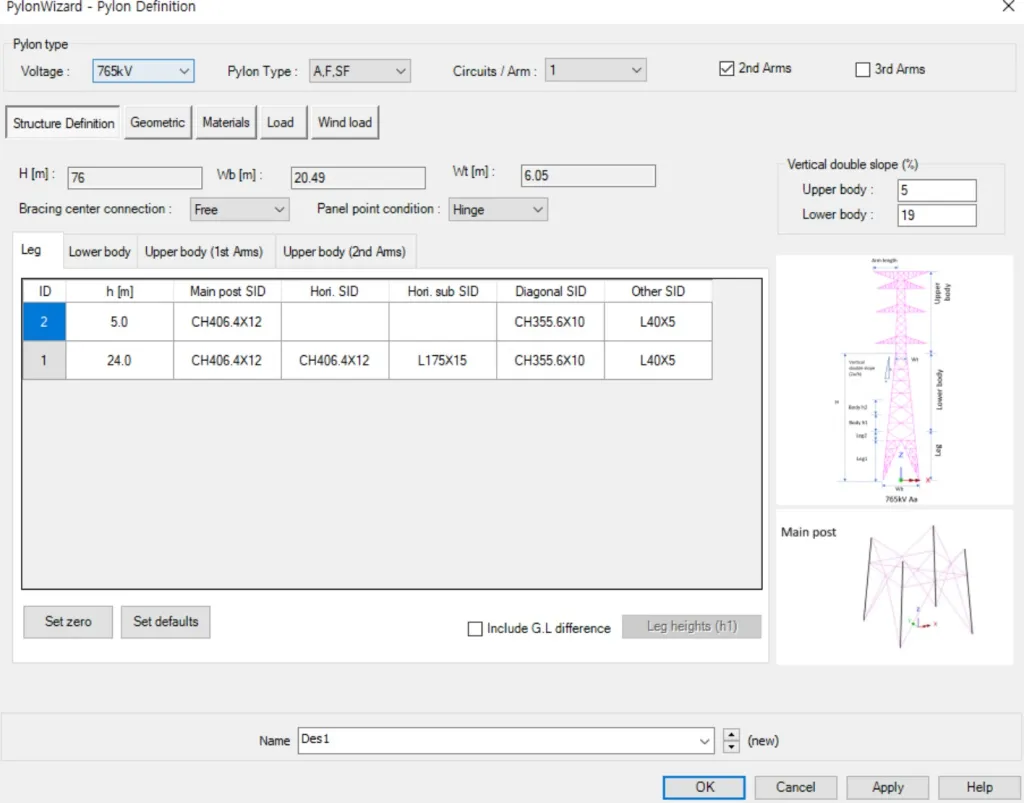 송전철탑 해석 모델링에 필요한 제원들과 기하특성, 재료특성 등을 Pylon Definition에서 정의합니다. Voltage 3가지(765kV, 345kV, 154kV) 각각에 현수형(Pylon Type : A,F,SF)과 내장형(Pylon Type : B,C,D,E)에 대한 표준 도면에 따른 초기값이 내장되어 있으며, 초기값으로부터 설계하고자 하는 철탑의 제원에 맞도록 수정합니다.