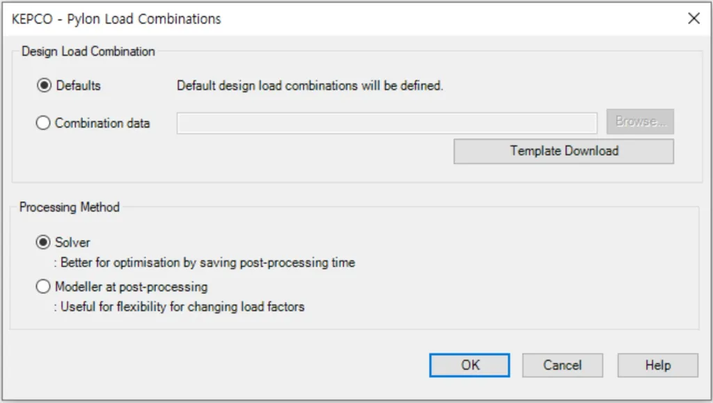 모델에 정의되어 있는 각 개별 하중케이스들을 대상으로 하중계수를 포함한 하중조합을 정의합니다. 기본값으로 Default 를 선택하고 OK 를 누르면, 현재 생성된 철탑의 형상에 필요한 하중조합을 생성하게 됩니다.