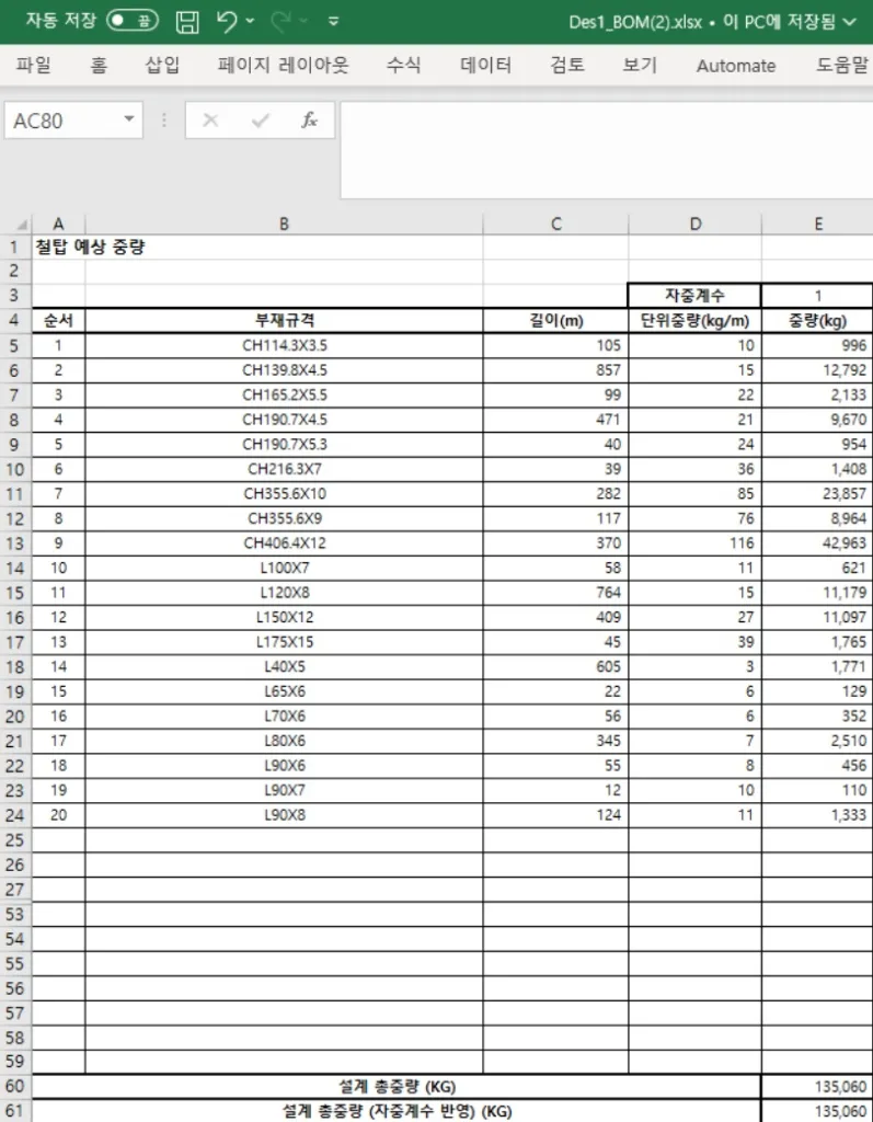 모델에 적용되어 있는 부재를 대상으로 산정한 총 중량을 Excel 보고서로 출력합니다.