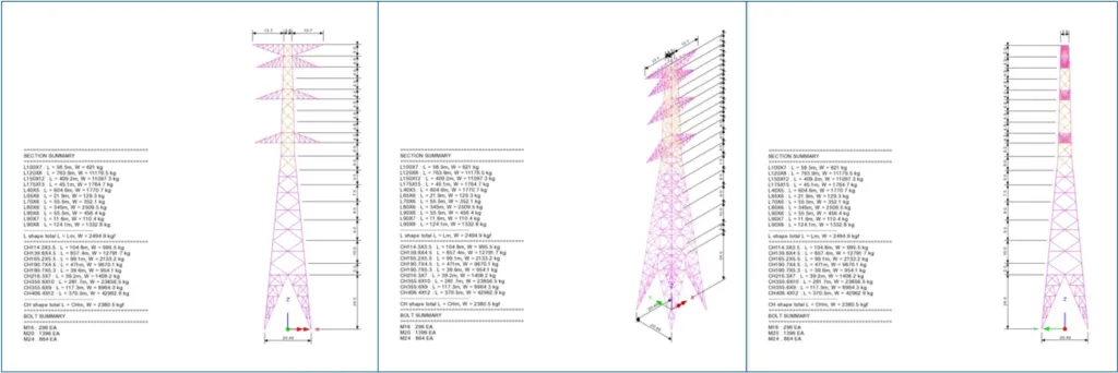규격과 물량을 표시하는 도면을 출력할 수 있으며, 각 하중케이스 별로 달라지는 형상을 이미지 파일로 쉽게 저장할 수 있습니다.