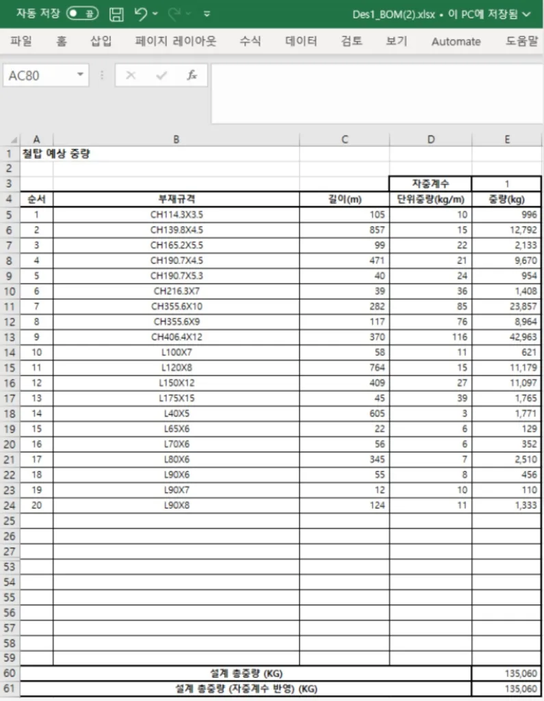 각 부재별 설계검토 보고서와 물량 보고서를 작성합니다.