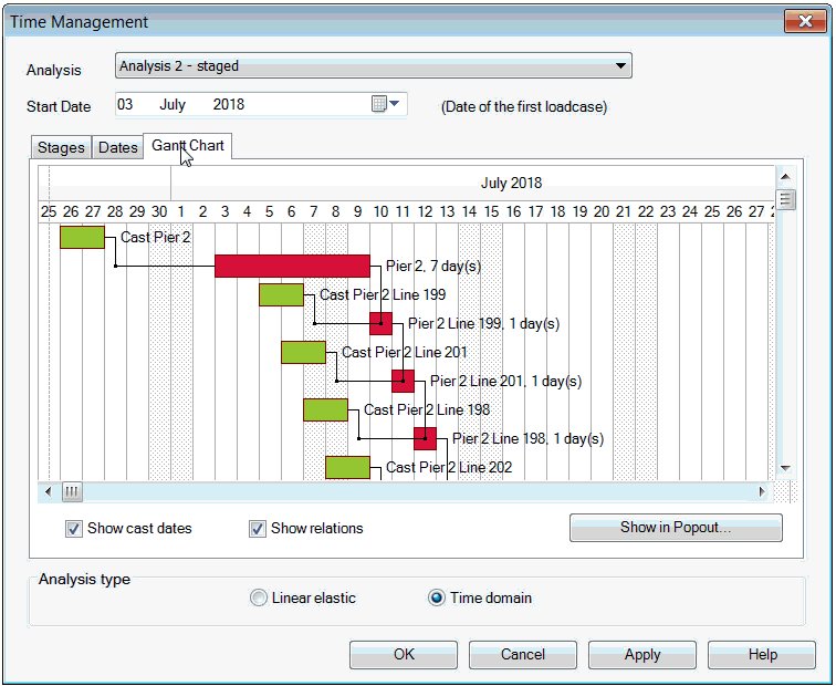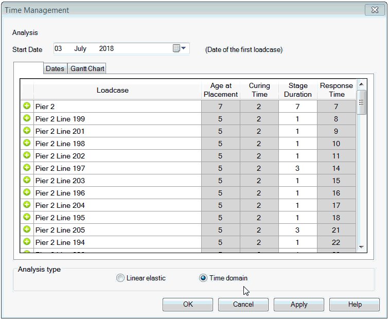 LUSAS는 구조물의 시공, 재시공 또는 해체 과정을 시간에 따라 모델링할 수 있는 기능을 제공하며, 이 과정에서 발생하는 구조적 변화, 하중의 적용, 그리고 시간 의존 재료 특성의 변화가 구조 거동에 미치는 영향을 평가할 수 있습니다.