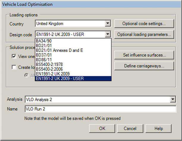 이 파일을 저장하면, 영국(United Kingdom)에 대해 Vehicle Load Optimisation 대화상자에 표시되는 사용 가능한 설계 기준 목록에 새로운 ‘USER’ 설계 기준 항목이 추가됩니다.