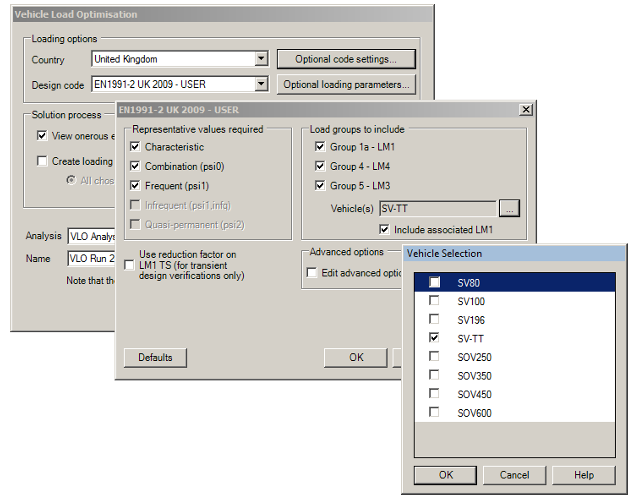 이 예제에서는 영국 고속도로청(Highways Agency)의 DMRB 코드 BD86/11(2011)에 정의된 평가 차량인 SV-TT(3.21)를 Vehicle Load Optimisation 대화상자에서 선택할 수 있도록 설정합니다.