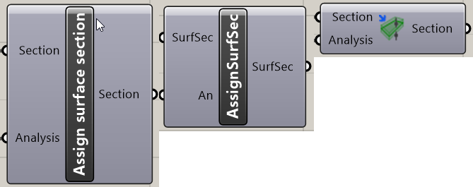 Assign section / material 구성 요소를 사용하면 특정 해석을 지정하거나 Section의 경우 선택적 Eccentrycity (이심률)값을 지정할 수 있습니다. 이들의 사용은 선택 사항입니다. 즉, 모델의 기본 해석을 가정할 경우 단면 또는 재료 구성 요소의 출력을 구성 요소에 직접 할당할 수 있습니다.