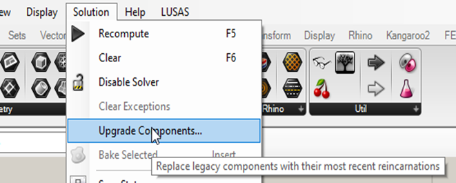 일부 구성 요소는 초기 출시 이후 매개 변수가 수정되었습니다(예: ‘Line/Surface’ 멤버 또는 ‘Analysis’ 구성 요소). 이러한 구성 요소는 기존 스크립트에서 ‘OLD’로 표시되며, Grasshopper 내에서 솔루션 > 구성 요소 업그레이드 메뉴 항목을 클릭하여 수동으로 업그레이드할 수 있습니다. (Solution > Upgrade Components)