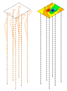 각 자동적으로 생성된 모델에서, 설계 응답 스펙트럼 등가 지진 기록들은 동시에 3방향에서 기둥을 세울 기반에 적용되었다. 이것에는 Load Curve를 이용한 Prescribed Acceleration 하중이 사용되었다.