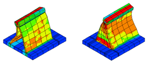 실물을 최적으로 이상화 시키기 위해서 Shell 요소와 Solid 요소를 사용하여 초기에 여러 가지 모델링 방법이 시도되었다. 실측에 의한 Load-strain 데이터를 확보함으로써 해석에 의한 결과의 유효성을 검증할 수 있었으며, 또한 해석을 수행하는데 소요되는 CPU 타임을 최소화 하면서 각 형태의 비선형 해석에 있어서 좋은 결과를 얻어내는 데도 큰 도움이 되었다. 이런 과정을 통해서 검증된 모델만이 다른 유사 형태의 구조에 적용하는 기초 모델로 사용이 되었다.