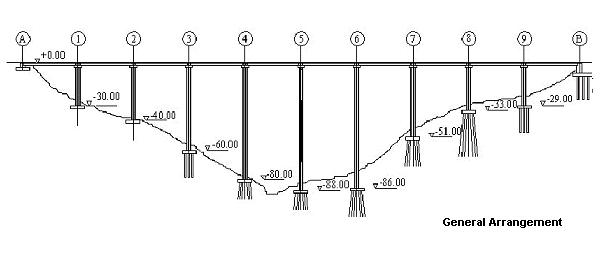의 결과의 비교로부터 짧은 교각들이 중간에 위치한 긴 교각들보다 더 큰 모멘트와 전단력을 견뎌내는 경향이 있음을 알 수 있었다. 따라서 실제거동의 좀더 정확한 예측을 위해 기하하적 비선형이 고려되어져야만 했다. LUSAS Bridge를 사용함으로써 산출된 modal frequencies와 측정된 modal frequencies 사이의 매우 적절한 상호관계를 얻어낼 수 있었다. 이번 연구조사는 고가교가 3가지 다른 주파수 지역에서 3가지 다른 동적현상을 보여주고 있다는 것이 제시되었다.