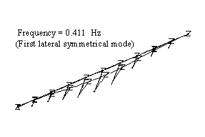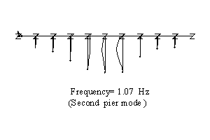 ●0.4-1 Hz의 첫 번째 저주파수의 범위내에서는, 상대적으로 큰 처짐이 주요문제가 되었으며, 전체구조가 처짐에 아주 민감한 것으로 나타났다. 구조물은 저차모드에서 댐핑의 영향을 받게되므로 교각은 in-phase 거동을 보이게 된다. 산출된 기여도는 최초의 3차 modes가 구조물에 약 90%에 영향을 주고 있다는 것을 보여준다. 그에 따라, 1Hz