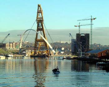 Gateshead Millennium Bridge는 Tyne강을 가로지르는 교량으로 경관이 아주 미려하다.