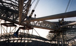 Trestle에 케이블에 긴장력이 도입되지 않은 상태로 지붕 구조을 앉히는 단계로부터 시작하여, 인장력을 증가시켜 두 케이블에 25% 인장력이 가해지는 단계까지 여러번의 LUSAS 해석이 수행되었다. 모든 케이블이 이 정도 수준의 인장력에 도달하고 난 후에는 다시 50%, 75%, 90%, 그리고 100% 수준으로 목표를 설정하여 같은 과정을 반복하였다. TGP사는 이러한 인장 단계는 실제 시공에 적용되었는데, 선형 해석 접근과 Catenary 효과를 고려하지 않은 모델링으로 인해 최종 인장력의 25% 수준의 케이블 인장 상태에의 현장 상황은 LUSAS 모델링에서 예측되었던 응답과는 다소의 차이를 보였으나, 나중에 90% 수준과 그 이상에서는 LUSAS 모델링과 아주 잘 맞았다. Permanent works design의 개념은 어떤 적절한 인장력이 적용되면, 지붕구조는 trestle로부터 들려 올라간다는 것이다. LUSAS를 사용하여, 최종 인장력의 80~90% 단계에서 부반력이 발생될 것이 예측되었고, 실지로 미소한 양의 들림이 발생하였다. LUSAS를 사용한 별개의 모델링 작업을 하는 과정과 Permanent work designer가 명시한 인장력이 적용되었을 때 지붕이 들리게 하는 것 등은 그들이 작업이 성공적이었음을 효과적으로 확신하게 하였다.
