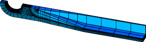 정부의 LINK Composite Structures 계획안의 투자 하에, Composite Landing Gear Strut 는 설계되었고 테스트되었다. LUSAS를 이용하여 3개의 composite Strut 배치에 대해 압축과 인장력 하에서의 레이업 배열을 결정하기 위해 정적 선형 해석이 착수되었다. 대칭구조이므로, Strut 의 1/8 만을 모델링에 반영해서 해석하였다. 16개 절점을 가진 고급 Solid Composite 요소가 모델의 각 부분 모델링에 사용되었고, LUSAS tied-slideline 기능이 단면 사이에 메쉬 간격이 일정하지 않은 부분을 효과적으로 접합하기 위해서 사용되었다. pin 하중을 대표적으로 free edges 상태의 바운더리 컨디션하에 lug 에 적용되었다. 3개의 tension 과 3개의 compression 에 대한 총 여섯개의 해석이 수행되었다. 압축과 인장력 각각에서의 최대 전단응력을 얻어내었고, 합성단면 사이에서의 전단응력 분포의 검토를 통해서 Composite Strut 의 배치를 최적화할 수 있었다.