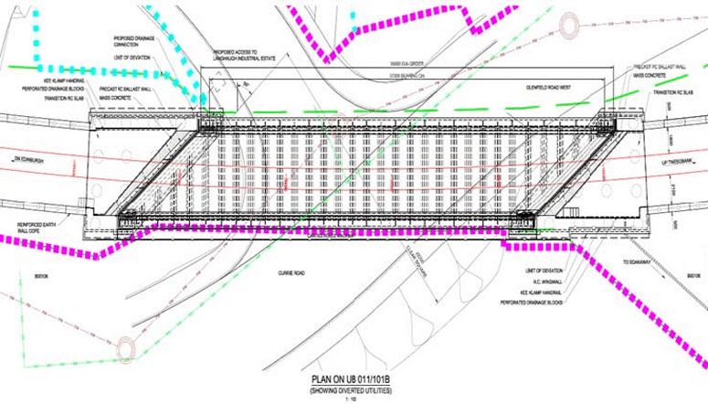 보더스 철도 프로젝트의 시공 단계는 네트워크 레일과 스코틀랜드 교통부, 스코틀랜드 보더스 카운슬, 미들로디안 카운슬, 에딘버러 시티 카운슬 및 계약자 BAM Nuttall의 파트너십으로 수행되고 있습니다. 앳킨스는 세계 유수의 엔지니어링 및 설계 컨설팅 회사로, BAM의 설계자 및 검토자로 고용되어 LUSAS 교량 해석 소프트웨어를 사용하여 프로젝트의 다섯 개의 넘어진 교량과 두 개의 지하교량 해석 및 설계를 지원하였습니다. 커리 로드 교량도 그 중 하나입니다. 개요 31마일(50km) 길이의 보더스 철도는 100년 이상 영국에서 건설된 새로운 국내 철도 중 가장 긴 노선입니다. 프로젝트의 주요 시공 작업은 2013년 4월에 시작되었으며, 2015년에 완공되면 에딘버러 시와 스코틀랜드 보더스의 트위드뱅크 마을을 45년 이상 만에 재연결하며, 혼잡한 지역 도로망에 대한 빠르고 효율적인 철도 승객 서비스를 제공합니다. 노선은 사실상 이전 웨벌리 철도 노선의 경로를 따르며, 이는 1849년경에 발주되고 1969년경에 폐지되었습니다. 이 프로젝트는 두 개의 터널과 95개의 기존 교량을 보수해야 하며, 다양한 유형의 42개의 새로운 교량을 건설해야 합니다. 이 새로운 지하교량 중 하나는 커리 로드와 글렌필드 로드 사이의 전환을 통해 단일 배럴 형상의 트랙을 지탱하고 있습니다. 이 반통형 강교는 전체 거더 길이가 39미터이며 50도라는 높은 비스듬함을 가지고 있습니다. |