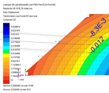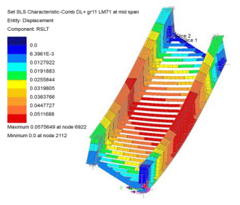 트랙 게이지의 최대 비틀림은 BS EN 1990:2022+A1:2005 A2.4.4.2.2에 따라 변위 윤곽 플롯을 사용하여 정확하게 검증되었습니다. 트랙과 구조물 간의 상호작용은 EN1991-2:2003 조항 6.5.4.6.1에 따라 단일 덱에 대해 주어진 변위 기준을 사용하여 간소화된 계산 방법으로 고려되었습니다.