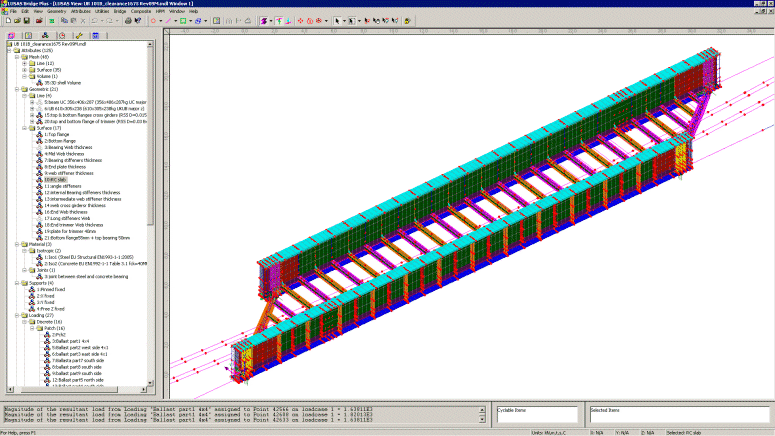 50도 기울기의 반통형 강교 덱에 대한 네트워크 레일 기준 도면은 8개에서 10개의 지지대가 사용되도록 지시하고 있습니다. 이 ‘기준’ 설계에서 각 주요 강재 거더는 두 개의 큰 지지대에 앉고, 각 끝 트리머는 끝 트리머 길이에 따라 2개 또는 3개의 지지대에서 독립적으로 지지받습니다. LUSAS를 사용하여 앳킨스는 끝 트리머를 주요 거더에 연결함으로써 사용되는 지지대 수를 10개에서 4개로 줄일 수 있음을 보여주었으며, 이는 최종 설계에 채택되었습니다.
