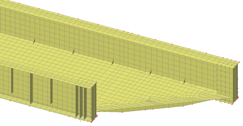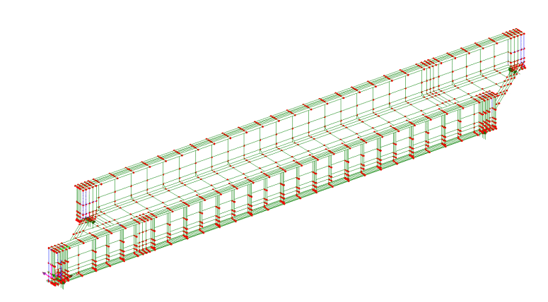 슈퍼구조물의 3D 유한 요소 모델이 LUSAS에서 개발되었으며, 쉘 요소가 주요 강재와 보강된 콘크리트 슬래브를 나타냈습니다. 크로스 거더 웹과 끝 트리머 웹도 쉘로 모델링되었으며, 상부와 하부 플랜지는 해당 단면 속성이 있는 빔으로 표현되었습니다. 지지대 스티프너와 잭킹 스티프너 사이의 보강된 콘크리트 상자는 솔리드 요소로 표시되었으며, 이들은 각각의 강재 요소에 접촉을 통해 연결되었습니다. 구조 설계는 75mph의 열차 교통 설계 속도를 기준으로 하였습니다.