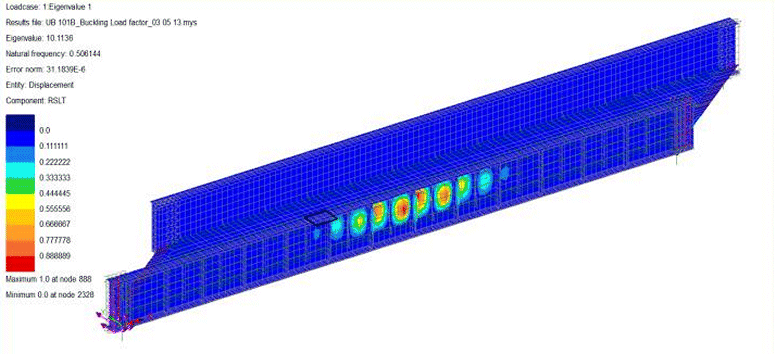 선형 고유값 해석이 네트워크 레일 표준 NR/L2/CIV/003/F1993에 따라 수행되었습니다. 이 문서는 BS EN 1993: 유럽 표준 – 강구조물 설계에 의해 허용된 선택 가능한 개방 옵션/선택에 대한 네트워크 레일의 지침을 제공합니다. 따라서 CAT II 점검하에 2차 해석을 허용하지 않으며, 10보다 큰 중요한 하중 계수가 필요합니다.