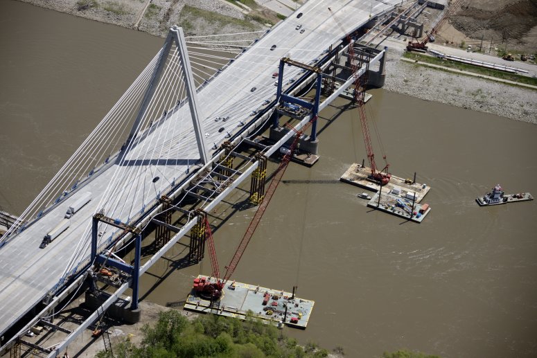 상세한 철거 순서를 PCC와 함께 개발한 후, 제니시스 구조는 모든 제안된 철거/제거 단계를 시공 모델에 추가하여 구조물에 미치는 영향을 평가했습니다. 마모층, 슬래브, 스트링거 및 선택된 바닥 보가 상부 구조에서 제거되어 최소한의 구조적 구성만 남겨두었습니다. 철거를 지원하기 위해, 각 36″ 직경 파이프가 여섯 개의 말뚝 구성으로 보강된 4개의 가짜 기둥이 중심 경간 아래에 설치되었습니다. 이러한 기둥의 잭과 기존 교량 기둥 위에 설치된 스트랜드 잭 시스템은 장축 거더를 들어올리고 주요 현수 케이블에서 남아있는 상부 구조의 하중을 제거했습니다.