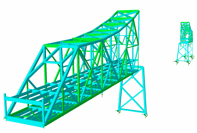 두 개의 교량 절반이 분리된 후, 해체 공정 과정에서는 여러 단계를 준수해야 하였습니다. LUSAS에서 정의된 여러 하중 사례를 정의하여 다양한 장비 배치 및 트러스 부재의 제거(모델에서 비활성화) 및 임시 트러스 부재 및 지지 구조물을 설치(모델에서 활성화)를 고려하였습니다. LUSAS에서 수행된 모델링 공정은 엔지니어들이 주요 하중 경로 부재를 제거해야 하는 주요 해체 단계와 임시 부재가 설치되어야 하는 시기를 식별하는 데 도움을 주었습니다. 여러 해체 단계에서 주요 트러스 부재가 상당한 잔여 긴장을 포함하여 제거되었습니다. 기존 부재와 새로운 임시 부재 간에 갑작스럽고 통제되지 않는 힘의 이동을 방지하기 위해 지역 긴장 해방 장치가 사용되었으며, 이는 LUSAS 모델을 통해 설계된 힘과 변위를 기반으로 하였습니다.