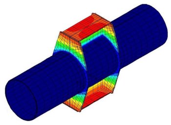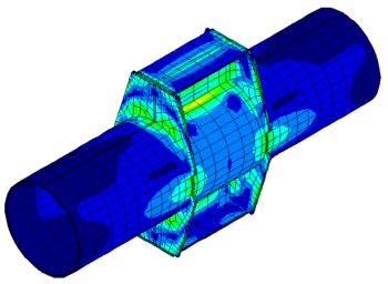 지지 브래킷 지지 브래킷에 대한 3D 모델이 상대적으로 경직된 원주 방향 제약으로 인해 발생하는 냉각 및 열 응 stresses를 조사하였습니다. 브래킷은 열충격을 받을 가능성이 적지만(판이 얇기 때문에) 파이프에 대한 온도 기울기가 발생하여 이러한 판이 파이프 내부에서 열기를 발산하게 됩니다. 따라서 브래킷은 성능 향상을 위해 추가 설계 및 모델링이 필요하였습니다. |