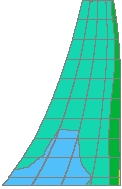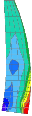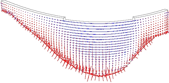 LUSAS 토목 및 구조에서 8절점 강화 변형 요소를 사용하여 댐과 그 바위 기초의 전체 3D 모델을 정의하였으며, 댐의 폭에 대해 4개의 요소와 2.5m 높이 간격으로 배치하였습니다. 전체적으로 9528개의 요소가 댐 모델을 정의하는 데 사용되었으며, 이 중 5880개 요소는 바위 기초에서 사용되었습니다.