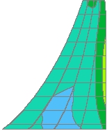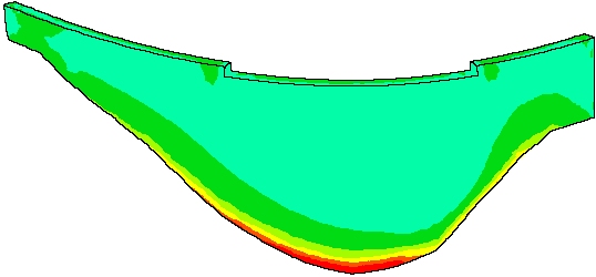 다양한 하중 사례에서의 선형 해석 결과는 정상 조건에서 최대 압축 응력이 6N/mm²로 발생했으며, 이는 25N/mm²의 특성 콘크리트 강도에 대해 안전율 3을 허용한 후 최대 허용 응력 8N/mm² 이내에 있음을 나타냈습니다. 응력이다. 또한, 몇 가지 하중 사례에서 인장 응력도 발생하였으며, 주로 상류 힐에서 관찰되었습니다. 인장 응력의 분포 범위는 특정 노드에서의 실제 크기보다 더 중요하며, 이는 응력 대칭 해석을 통해 더 조사되었습니다. 이 해석에서는 응력이 발생하는 지역에서 균열이 전파될 수 있도록 설정하였습니다. 이는 저수지가 가득 차고 평균 연도 겨울 온도와 함께 저수지 머리의 상승력이 적용된 가장 비판적인 하중 사례에 대해 수행되었습니다. 이 ‘응력이 없는’ 해석은 균열 전파가 주로 댐/기초 접촉의 상류 4분의 1에서만 발생할 것임을 나타냈으며, 이는 허용 가능한 결과였습니다.