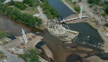 위치타, 캔자스는 자전거 및 보행자 교통 시스템이 150km 이상에 걸쳐 있으며, 그 중 많은 부분이 공원과 강을 따라 형성되어 있습니다. 강변 복도 개선 프로젝트의 일환으로, 총 길이가 각각 320피트 및 240피트인 두 개의 새로운 교량이 아칸소 및 리틀 아칸소 강을 넘어 “갈래의 지킴이”라고 불리는 45피트 높이의 아이코닉한 인디언 동상 부근에 건설됩니다. 이 교량은 현대적이고 대화식 과학 박물관인 Exploration Place와 문화적으로 중요한 중서부 인디언 센터를 연결합니다. 이 위치로 인해 케이블 스테이 교량은 깃털 모양과 원주율에 따라 변형된 독특한 스테이 케이블 구성과 날렵한 타워를 포함합니다. |
