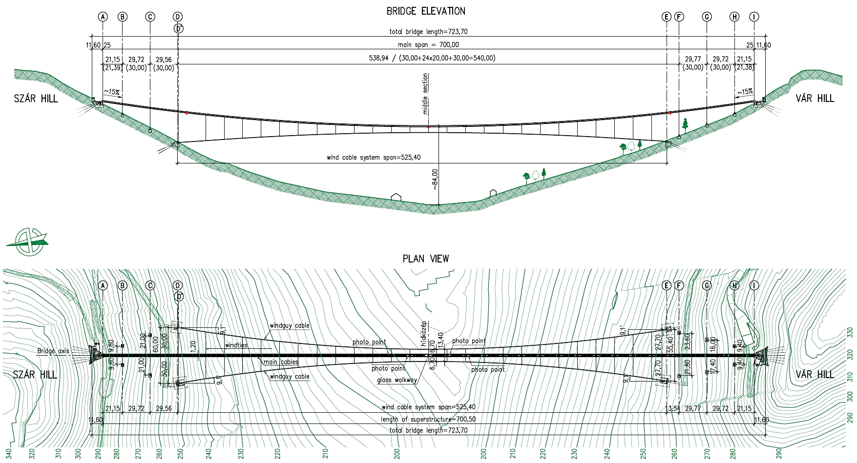 Zemplen 723은 캐터너리 교량으로, 전통적인 현수교와 달리 장대와 행거가 없기 때문에 보행자의 데크 높이는 6개의 주 케이블의 포물선 형태를 따릅니다. 중간 부분에서 유리 바닥이 있는 1.2m 너비의 양방향 보행로는 계곡 바닥에서 약 84m의 높이에 위치합니다. 이 교량은 두 개의 주요 풍 하중 케이블과 두 번째 풍 하중 타이 케이블로 구성된 풍 설계 시스템에 의해 보강됩니다. 두 개의 주요 풍 하중 케이블은 교량 쪽으로 기울어진 평면에 포물선 형태로 있습니다. 교량의 시작 부분에는 추가 고정 앵커 케이블이 제공됩니다. 6개의 주 케이블에서 발생하는 약 3300kN의 큰 인장력은 철근 콘크리트 교대에 통합된 강철 구조물에 의해 지탱됩니다. 전체 정적 평형은 다카이트 암석에 내장된 23m 길이의 스트랜드 앵커에 의해 보장됩니다. 이 시공에는 149톤(6490m)의 강철 케이블과 추가로 96톤의 구조 강철이 필요했습니다. 하부 구조(교대 및 풍 케이블 하부 구조물)는 1700m3의 철근 콘크리트로 구성됩니다.