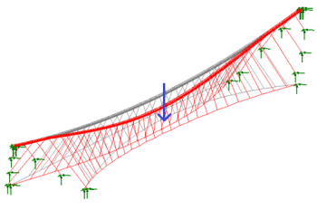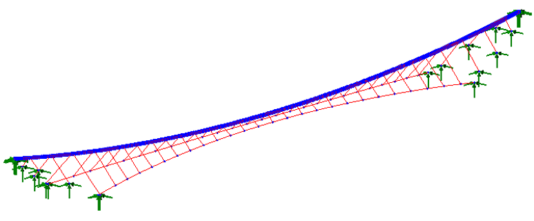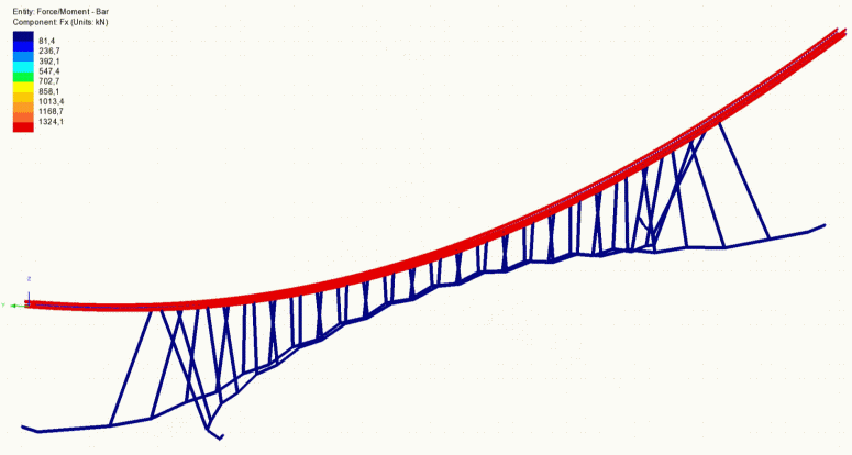 교량 설계에는 대변위와 케이블의 정확한 인장력 변화를 고려하기 위해 기하학적 비선형 시공 해석이 필요했습니다. 이와 같은 해석 기능을 위해 LUSAS 유한 요소 모델이 생성되었으며, 케이블은 막대 요소로, 교량 데크의 지지 프레임 요소는 빔 요소로 모델링되었습니다.