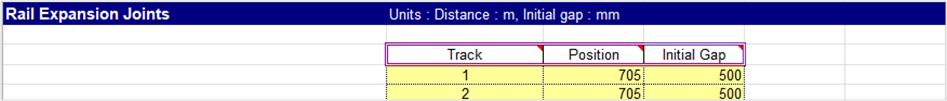 ② RTA_INPUT.xls의 Interaction and Expansion Joint 시트파일에 다음과 같이 레일신축이음매의 설치위치와 initial gap을 입력합니다.
