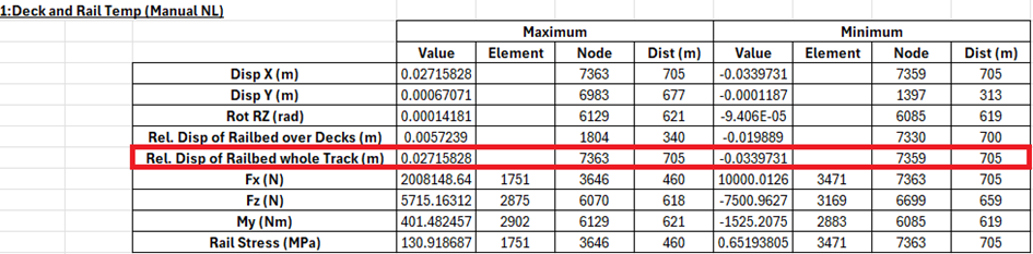 온도하중에 대한 레일 파단시 개구량은 다음과 같습니다. 전구간 레일의 교량 상판에 대한 상대변위는 Rel. Disp of Railbed whole Track(m) 값으로도 확인할 수 있습니다.