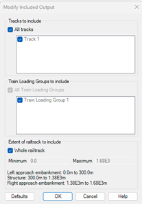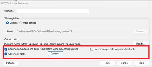 결과 출력 대상 (Track, Train Loading Set, 궤도 범위 등)을 선택적으로 지정할 수 있습니다.